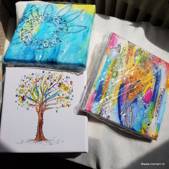Zur Zeit hat es 4 Kunstdrucke welche ich zusätzlich neu bemalt habe. Es wurden Striche in Gold oder Schwarz nachgezogen, neue Muster durch andere Materialien erschaffen. Je nach Bild, die Farben nochmals mit Künstlertusche bemalt, Mandala Glassteine oder kleine Strasssteine für eine 3 D Erhöhung geklebt und gepunktet mit Drop's Farben. 20 x 20 cm für 37.-- / plus 5.90 einmalig Versand Anteil es spielt dann keiner Rolle wie viele Leinwände es sind. Wie auch schon oben führt der Link hier: zu mehr Informationen.