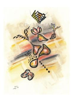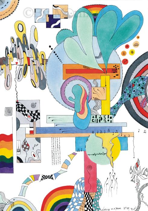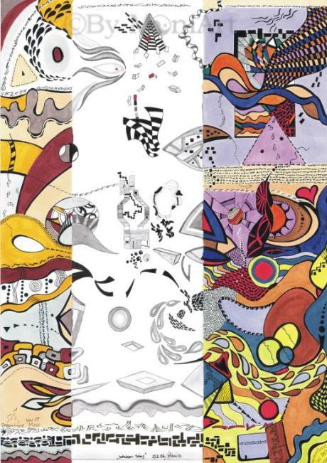 1997 fange ich an, mich für Computer Grafiken zu interessieren. In einem Grafikprogramm kreierte ich farbige Hintergründe und da wurden dann die vorher eingescannten Tuschebilder eingefügt. Am Anfang waren es nur einfache Muster, dann kamen ein paar verrückte Sachen dazu. Damals war das alles noch neu und einzigartig. Heute kann man im Handy solche Dinge machen...