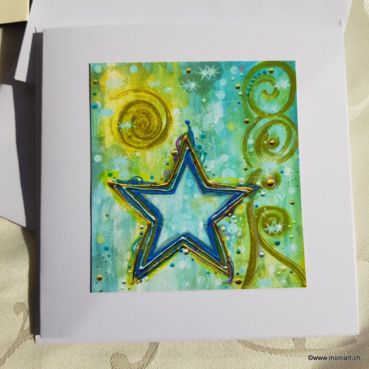 Karte: 15 x 10,5 / Sterne auf Aquarellpapier gemalt und geklebt