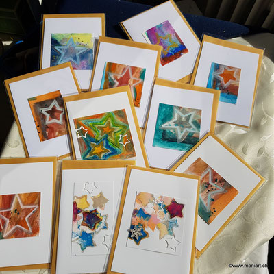 Kann man an Märkten, im Atelier Laden direkt aussuchen oder auch über den Link hier: Online Shop bestellen. Die Preise starten bei 5.-- gehen zu 5.50 / 6.00 und ein paar ganz edle und einzigartigen Karten sind 6.50 / Es ist Handarbeit mit Artoz und Schüch Verlag Material. Zum Teil sogar auf Büttenpapier gemalt. Es hat über 30 Karten im Shop und noch mehr zur Auswahl gibt es auch in Rupperswil im Atelier Laden ( ich habe Frei am DI und DO und an den Abenden, sowie SA, SO wenn hier) Kontakt: moni@moniart.ch WAAP 079 221 51 81